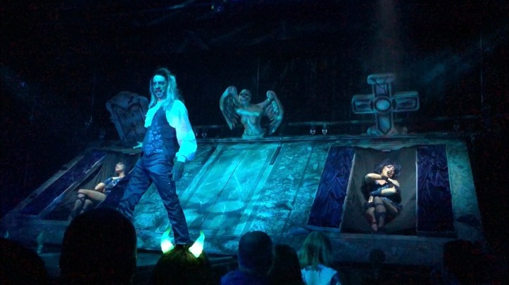 We made our way to be seated at our table. Our waitress wasting no time to splash us with drinks. A variety of cocktails, plenty of choice, but not the usual choices. We drank toward our demise and waited for the show to begin. At least in this house of horrors they fed and watered us well! The drinks were spectacular, cocktails in coffins, or floating on a sea of otherworldly mist, Sangria to share presented in a glass skull. Nicely done! The food was well presented and delicious, my friends and I were all satisfied with the fare we had chosen!
